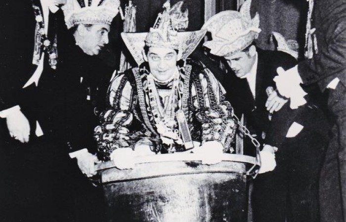 Het Prinselijk trio met rechts van Prins Cor I adjudant Jac van den Munckhof en links adjudant Piet Keijsers en helemaal rechts dansmarietje Fien Houben.